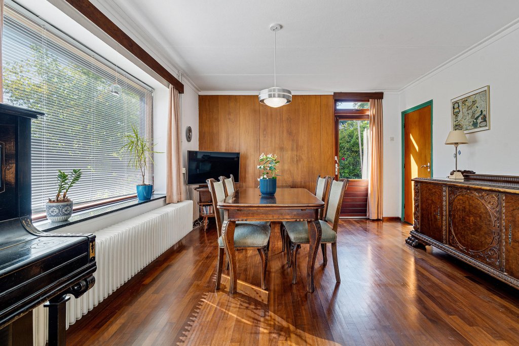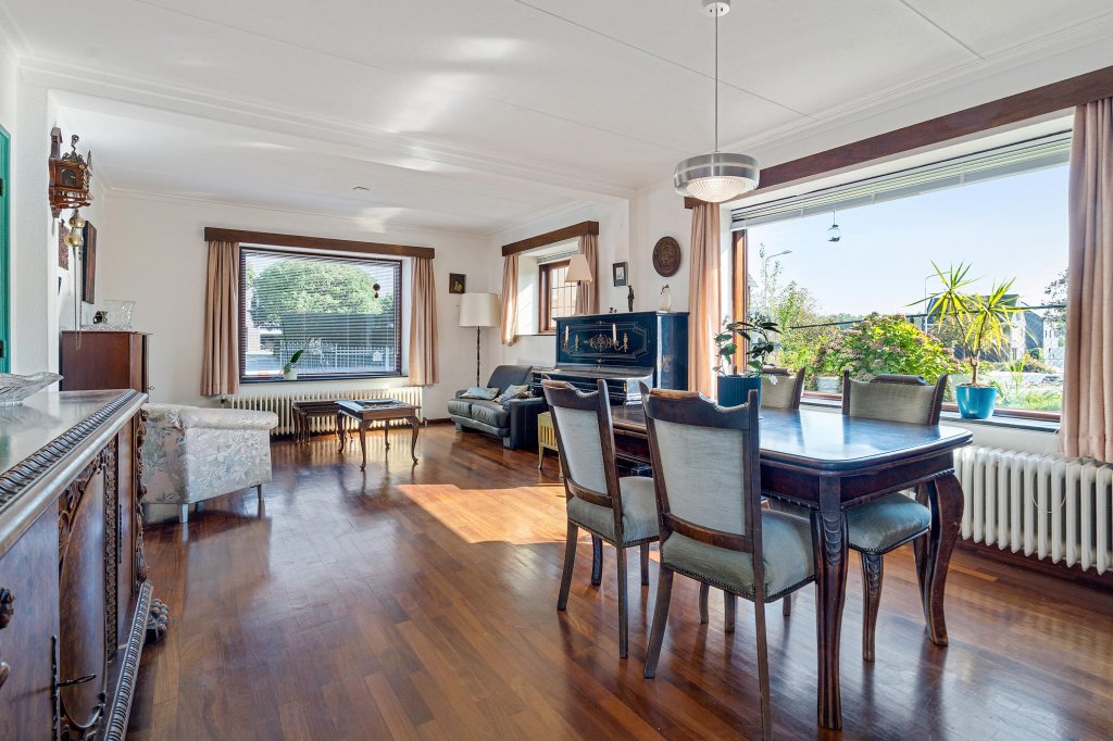 De woonkamer is licht en ruim door drie grote ramen en is afgewerkt met parketvloer. Via een tuindeur is er directe toegang tot de tuin. De keuken met eetruimte vormt één open ruimte. De keuken is voorzien van een oven, 4-pits gasfornuis en afzuigkap. In deze ruimte bevindt zich ook de CV-ketel (eigendom). Vanuit de keuken is de garage inpandig te bereiken; deze beschikt over een dubbele garagedeur.