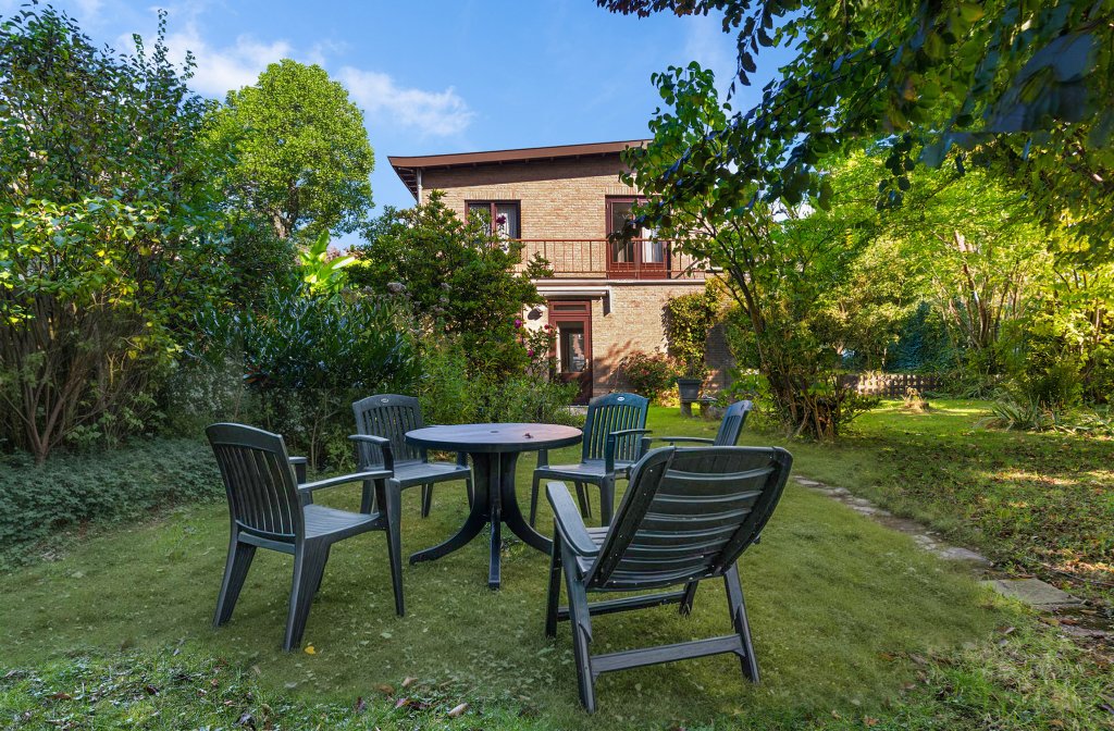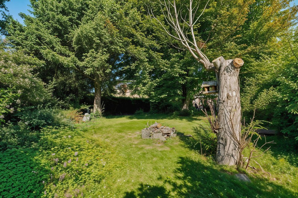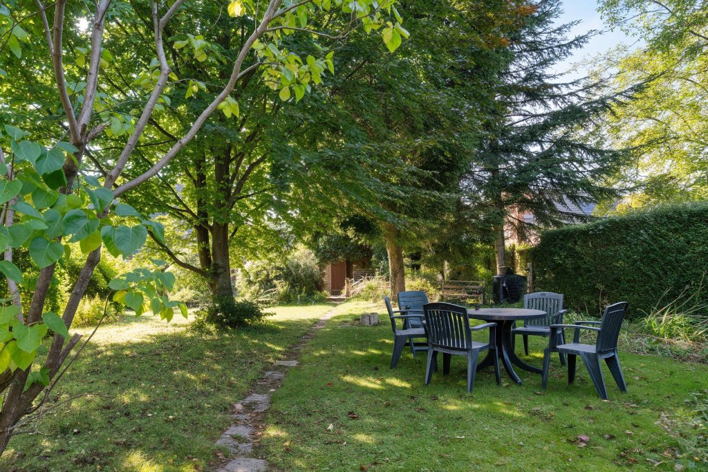 De diepe tuin is bosachtig en groen, met meerdere zitplekken en veel privacy. De tuin is toegankelijk via de woning, de achterpoort of de tweede garagepoort en biedt een heerlijke plek om te ontspannen of te spelen.