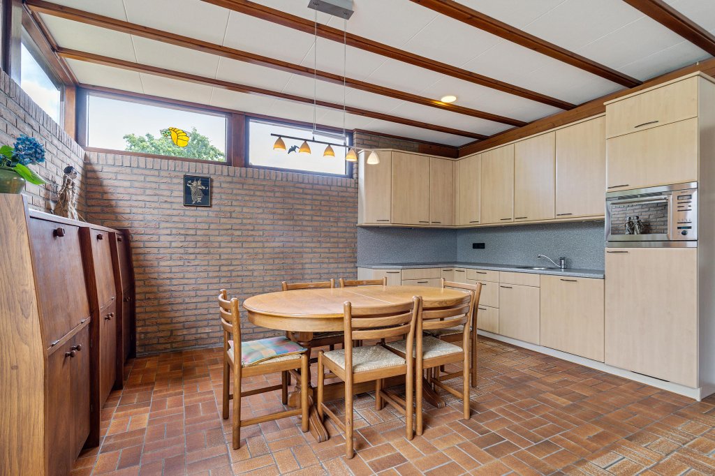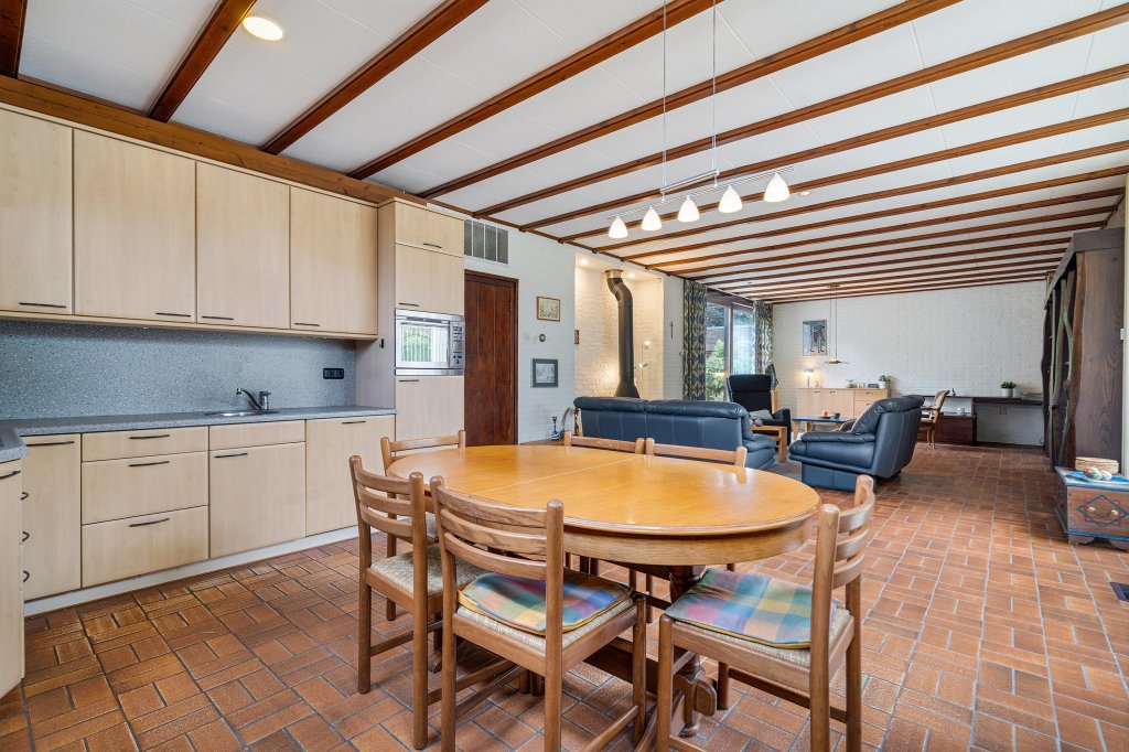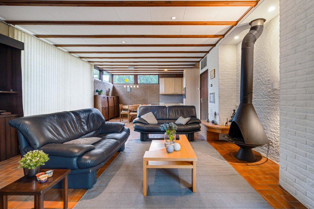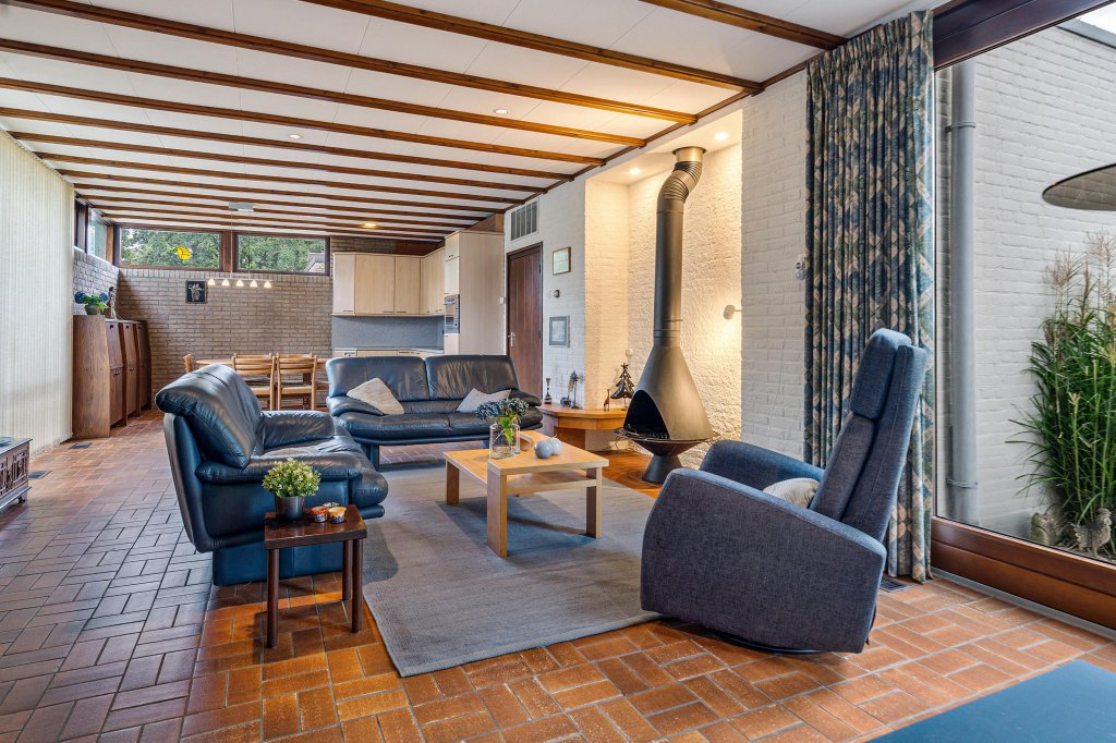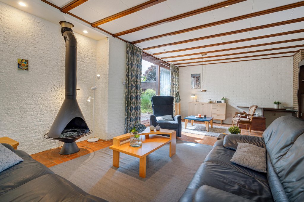 De woonkamer is licht en ruim dankzij de grote raampartijen en biedt een gezellig zitgedeelte met en schoorsteenhaard. Via de schuifpui heb je direct toegang tot de achtertuin. Vanuit de woonkamer loop je zo door naar de open keuken met eetgedeelte, voorzien van een combimagnetron, koelkast, vaatwasser, 4-pits inductiekookplaat en boven- en onderkastjes.