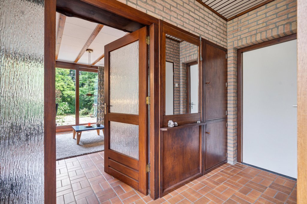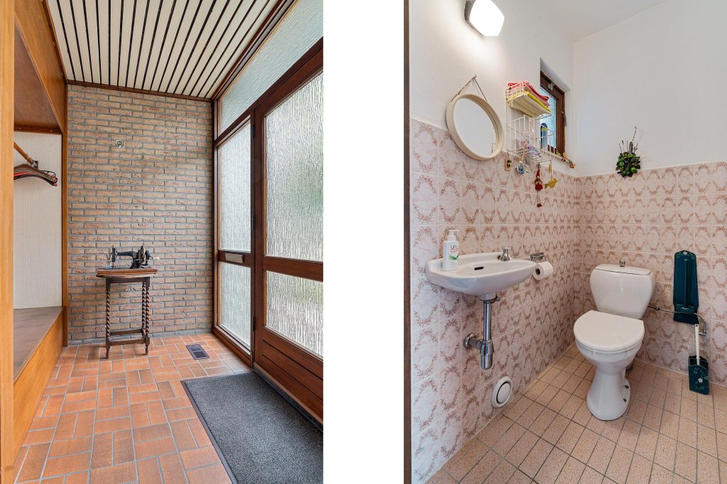 Je betreedt de woning via de oprit met voortuin, waarbij je kunt kiezen voor de poort aan de voorzijde of de voordeur aan de zijkant. Binnenkomst is in een ruime hal met garderobe en betegelde vloer. Vanuit deze hal heb je toegang tot het gastentoilet met fonteintje, de meterkast, de garage en de woonkamer.
