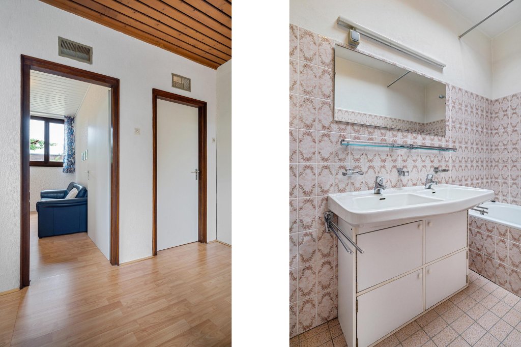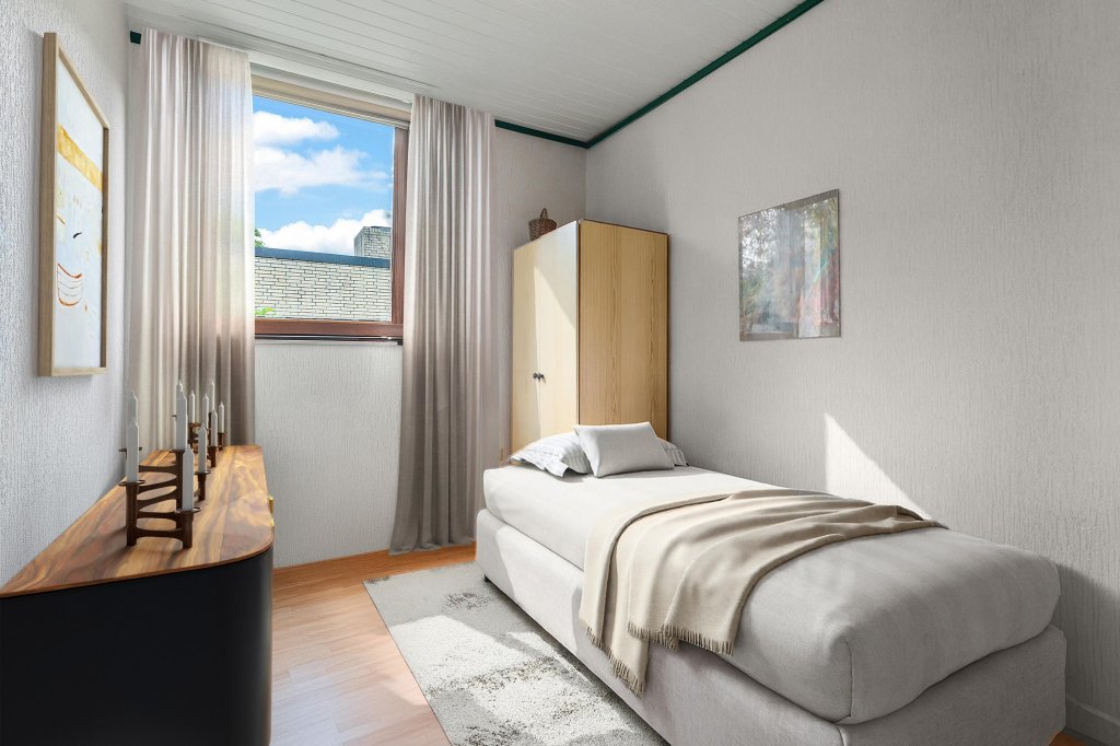 Vanuit de woonkamer heb je toegang tot een tweede hal. Vanuit deze hal bereik je vier slaapkamers, de badkamer en de vaste trap naar het souterrain.