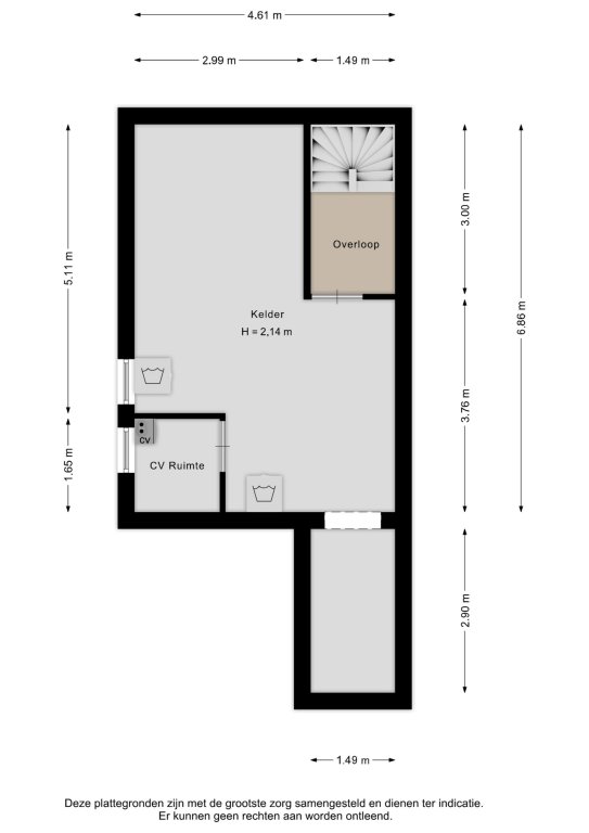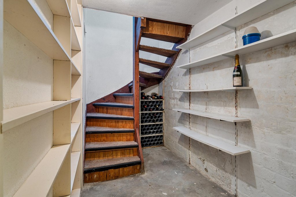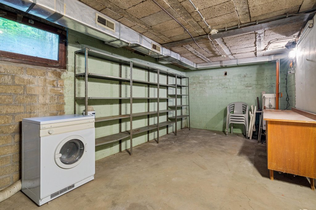 Vanuit de tweede hal op de begane grond bereik je via een vaste trap het souterrain. Hier bevindt zich de CV-installatie en de aansluiting voor wasmachine en droger. Dankzij de royale ruimte is dit ook een ideale plek voor extra opslag.