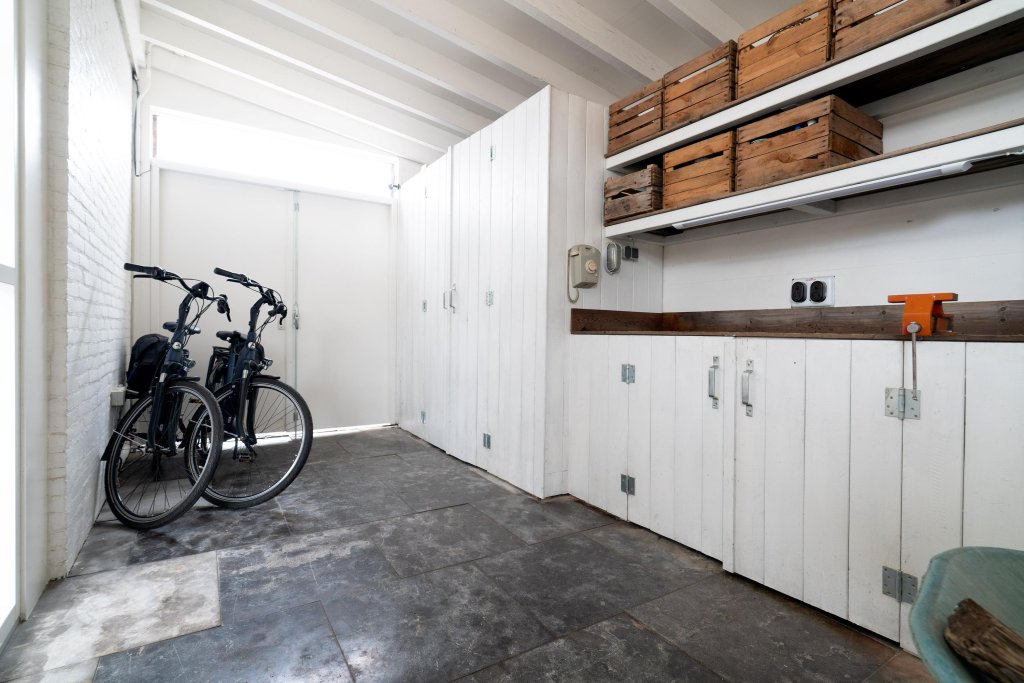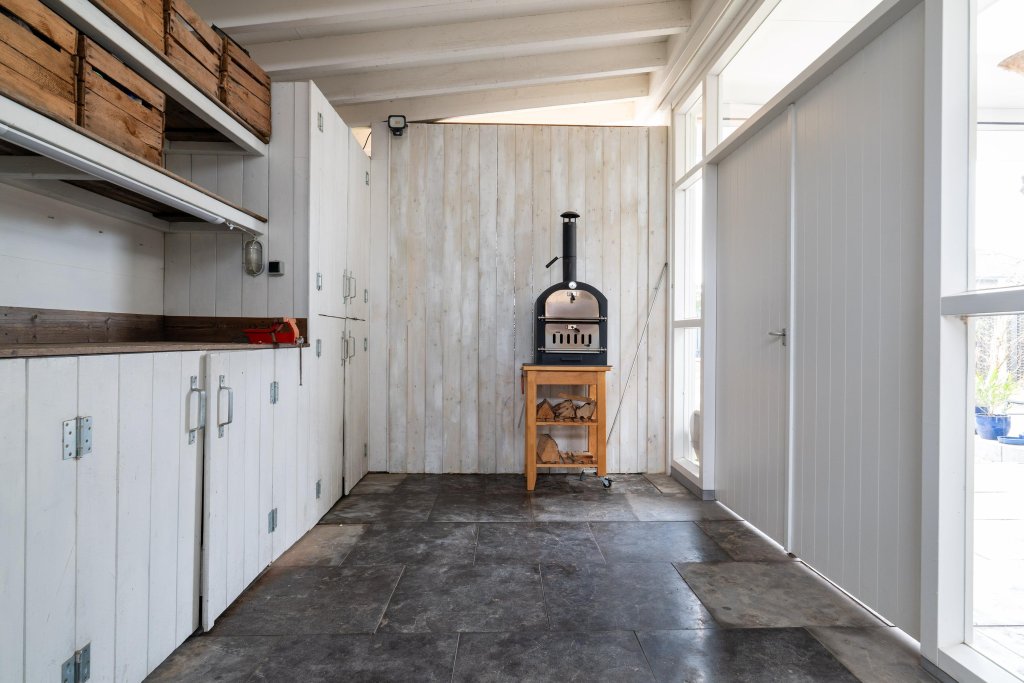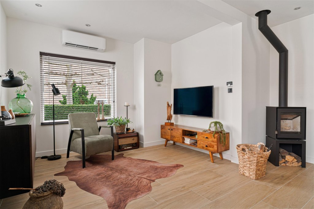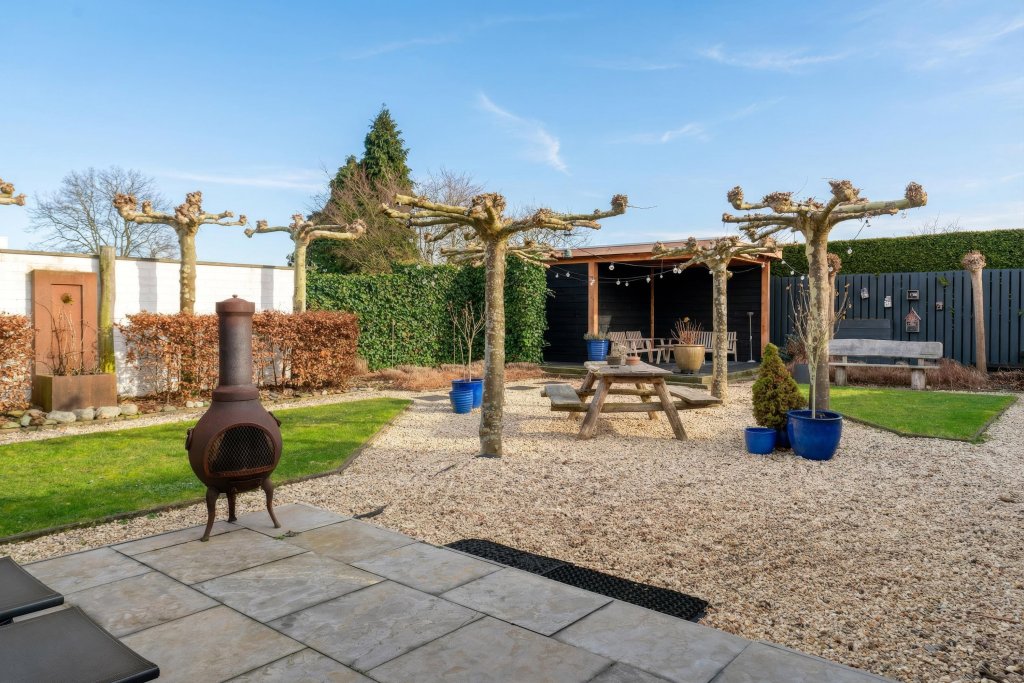Entree, fraaie lichte hal met vernieuwde meterkast, trapopgang en toegang naar luxe toilet en woonkamer. Het luxe toilet is ingericht met een hangend closet en fonteintje. Via een industriële stalen deur is de lichte L-vormige woonkamer bereikbaar. De sfeervolle woonkamer heeft een tegelvloer, airco en is ingedeeld in een zit-eetgedeelte, houtkachel en industriële stalen deuren naar de aanbouw. In de aanbouw is de eetkamer met nieuwe keuken gesitueerd. Open keuken met een grindvloer, zitgedeelte en moderne keukenopstelling met de volgende apparatuur: inductiekookplaat, afzuigkap, oven, koelkast en vaatwasser. Tevens bevindt zich hier een toegang naar de tuin en slaapkamer gelegen in de voormalige salon. De slaapkamer heeft een laminaatvloer en door de pui aan de voorzijde heeft het veel lichtinval. Toilet en wastafel aanwezig. De geheel omsloten speelse tuin is op het oosten gesitueerd en beschikt o.a. over een natuurstenen terras met fraaie overkapping die voorzien is van een screen. Tevens is de tuin ingericht met borders, zonneterras, gazon, tuinhuis met overkapping, overkapping waar nu de jacuzzi staat en heeft men aan de achterzijde vrij uitzicht. Aan de linkerzijde van de woning treft men een houten berging aan, die nu opslagruimte dient. Deze ruimte is bereikbaar via de tuin en via de opgang aan de linkerzijde.