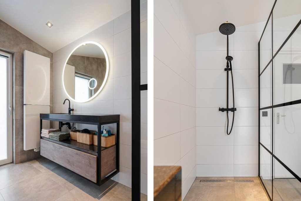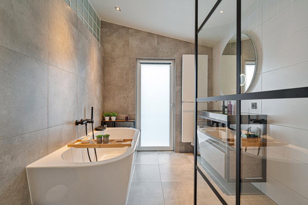 - Luxe design badkamer met inloopdouche met regendouche, ligbad en badmeubel met vaste wastafel en spiegel.