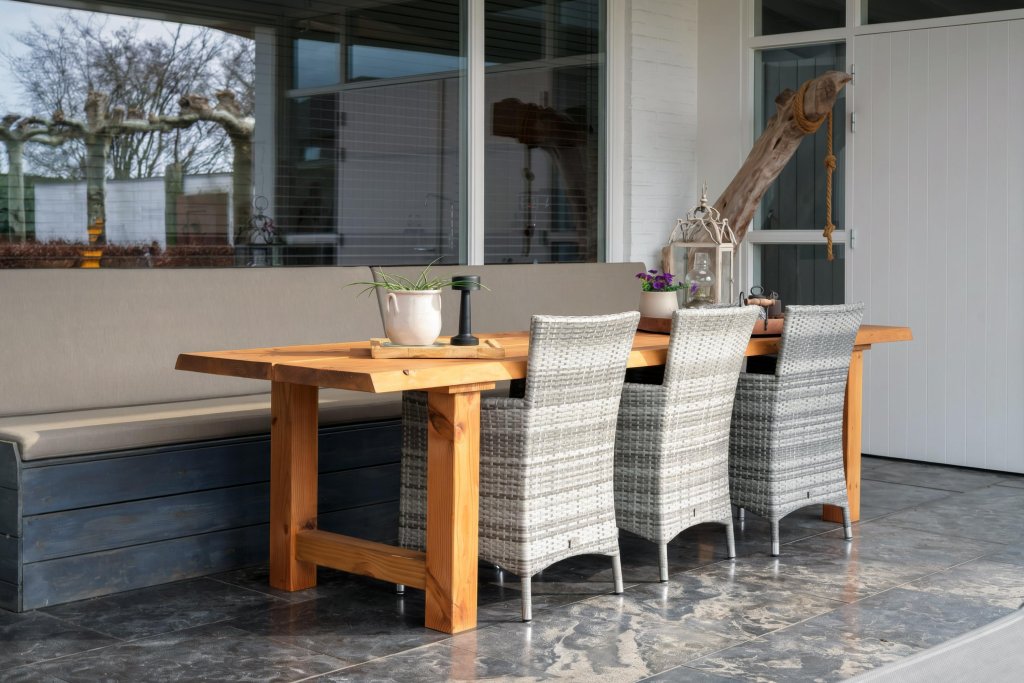 - Tuin: Screens bij overkapping, houten tuinhuis met overkapping;