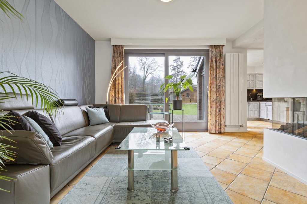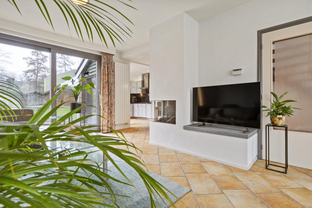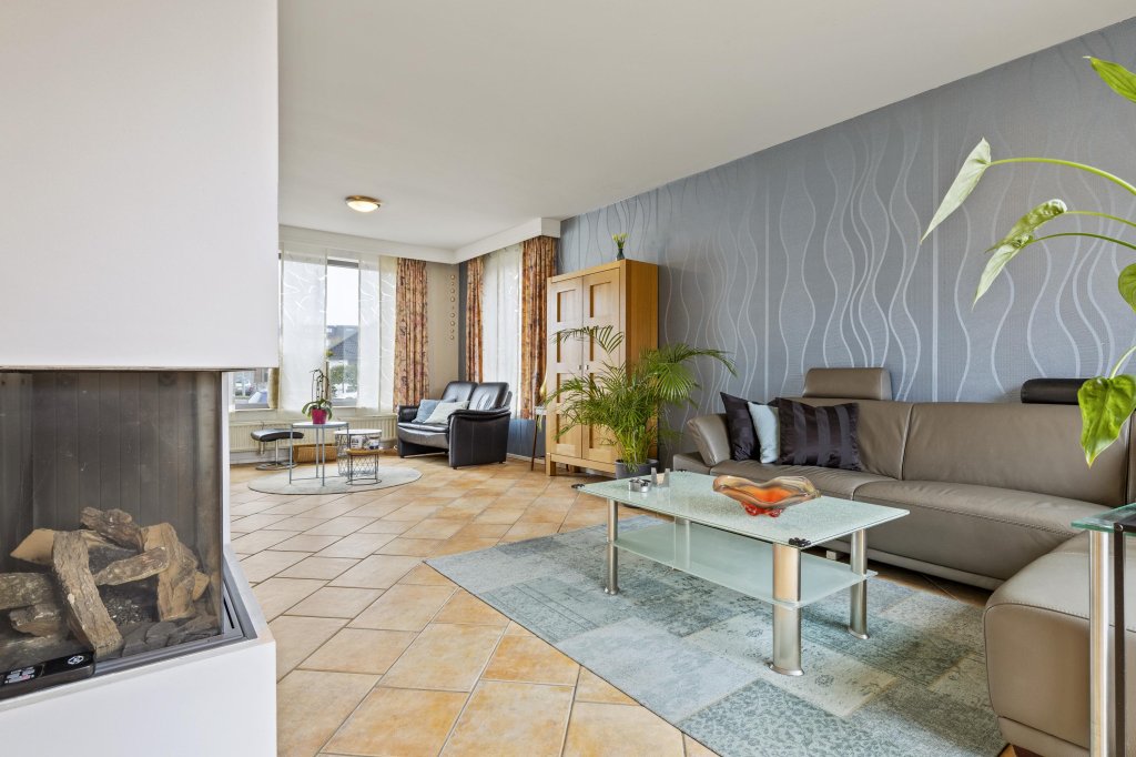 De openslaande deuren leiden naar de ruime woon-/eetkamer: een heerlijke leefruimte met veel lichtinval en een sfeervolle gashaard als warm middelpunt. Via de schuifpui loop je zo de achtertuin in, waardoor binnen en buiten naadloos in elkaar overlopen.