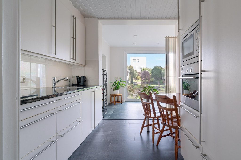 De halfopen, moderne keuken is uitgerust met diverse inbouwapparatuur, waaronder een inductiekookplaat, koelkast, magnetron, oven en vaatwasser. De keuken staat in prettige verbinding met de woon- en eetkamer, waardoor een open en lichte leefruimte ontstaat. Tevens heeft u in de keuken toegang tot een praktische inloopkast.