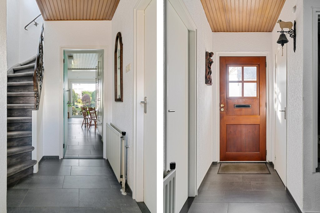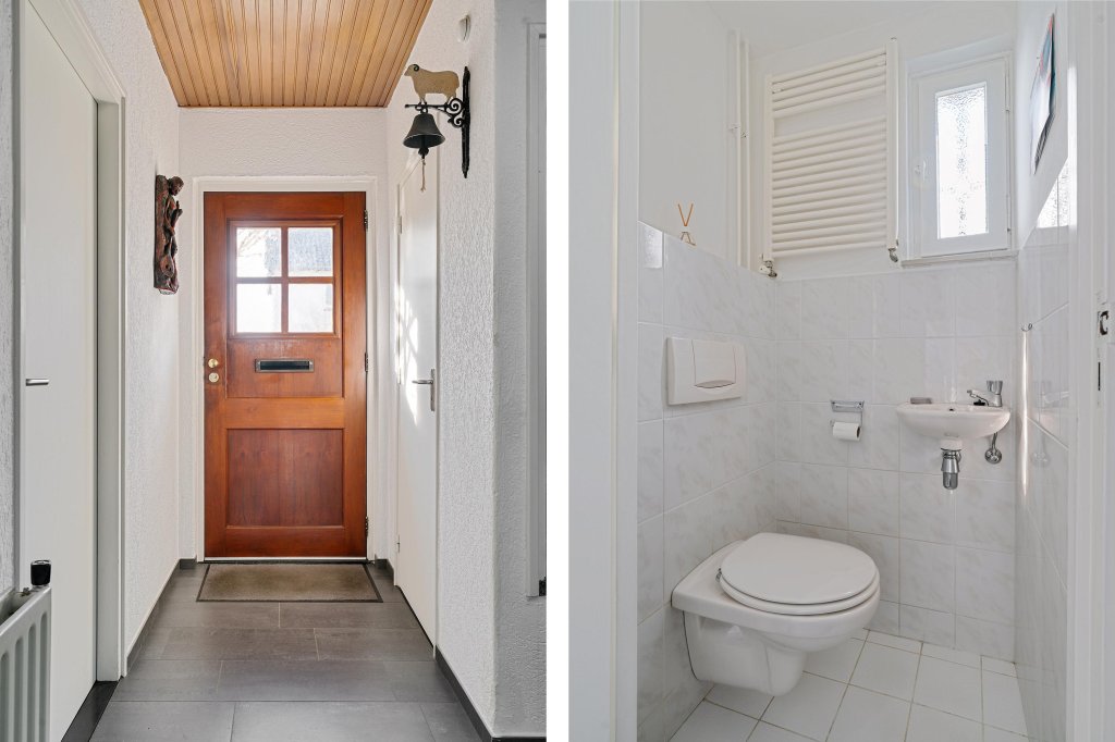 Via de entree bereikt u de hal met meterkast, trapopgang naar de eerste verdieping en een volledig betegelde toiletruimte met hangcloset en fonteintje.