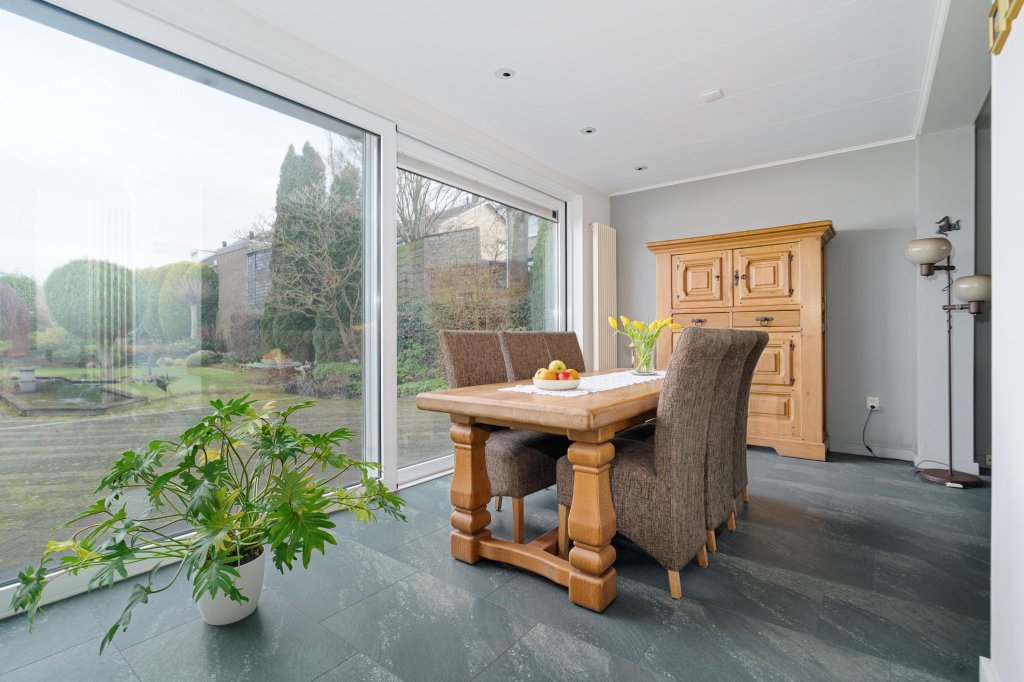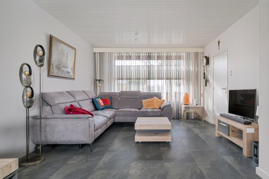 De woonkamer is ingericht met een zit en eetgedeelte en biedt via een schuifpui direct toegang tot de achtertuin, wat zorgt voor een fijne interactie tussen binnen en buiten – ideaal tijdens zonnige dagen of gezellige avonden met familie en vrienden. De woonkamer en de bijbouw is voorzien en een antraciet doorlopende pvc vloer. De keuken en de gang is voorzien van een grijze plavuizen vloer.