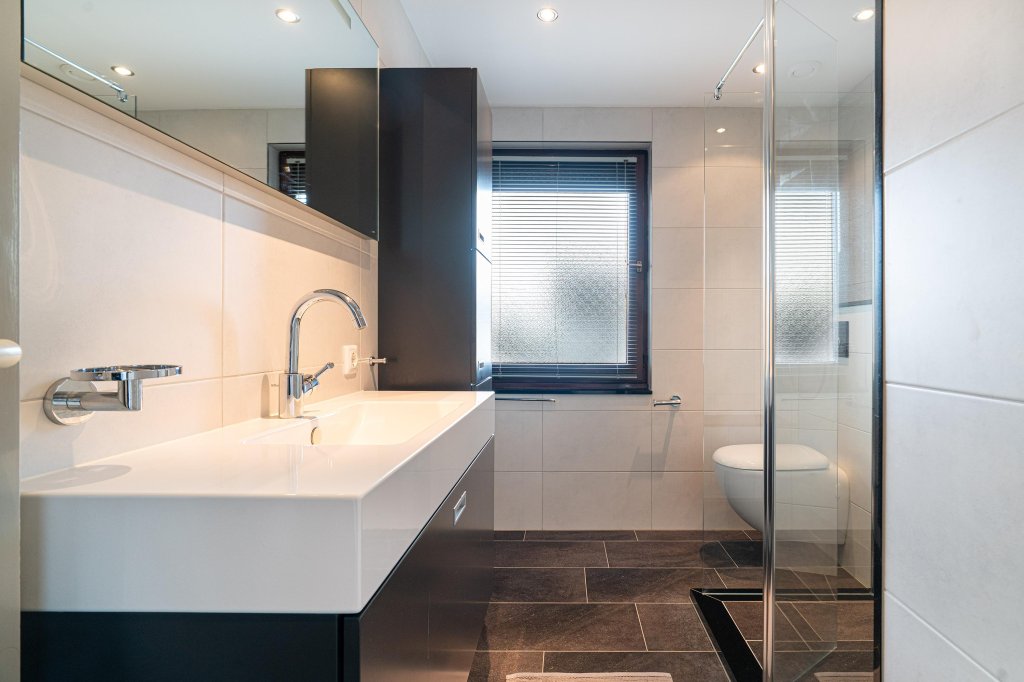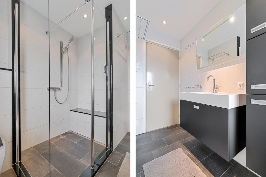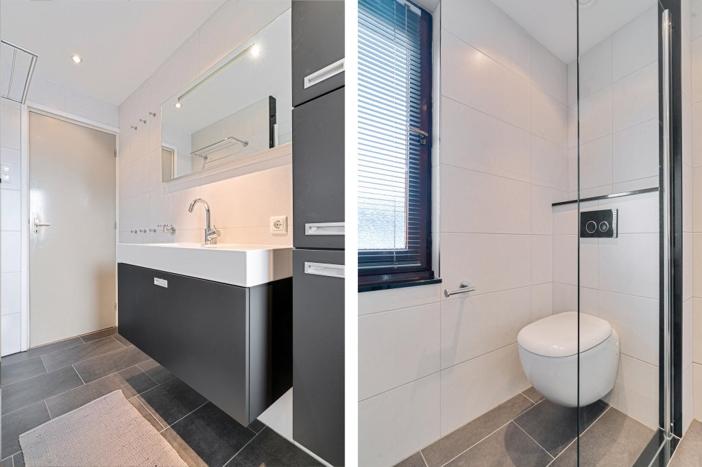 De volledig betegelde moderne badkamer is compleet uitgevoerd met een inloopdouche, hangcloset en wastafelmeubel en separate badkamerkast.