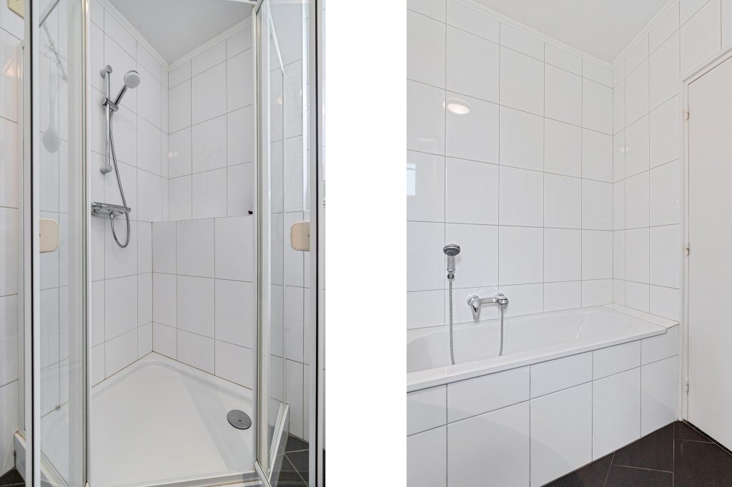 -Badkamer met een ligbad, inloopdouche, tweede toilet, designradiator en een wastafel.
